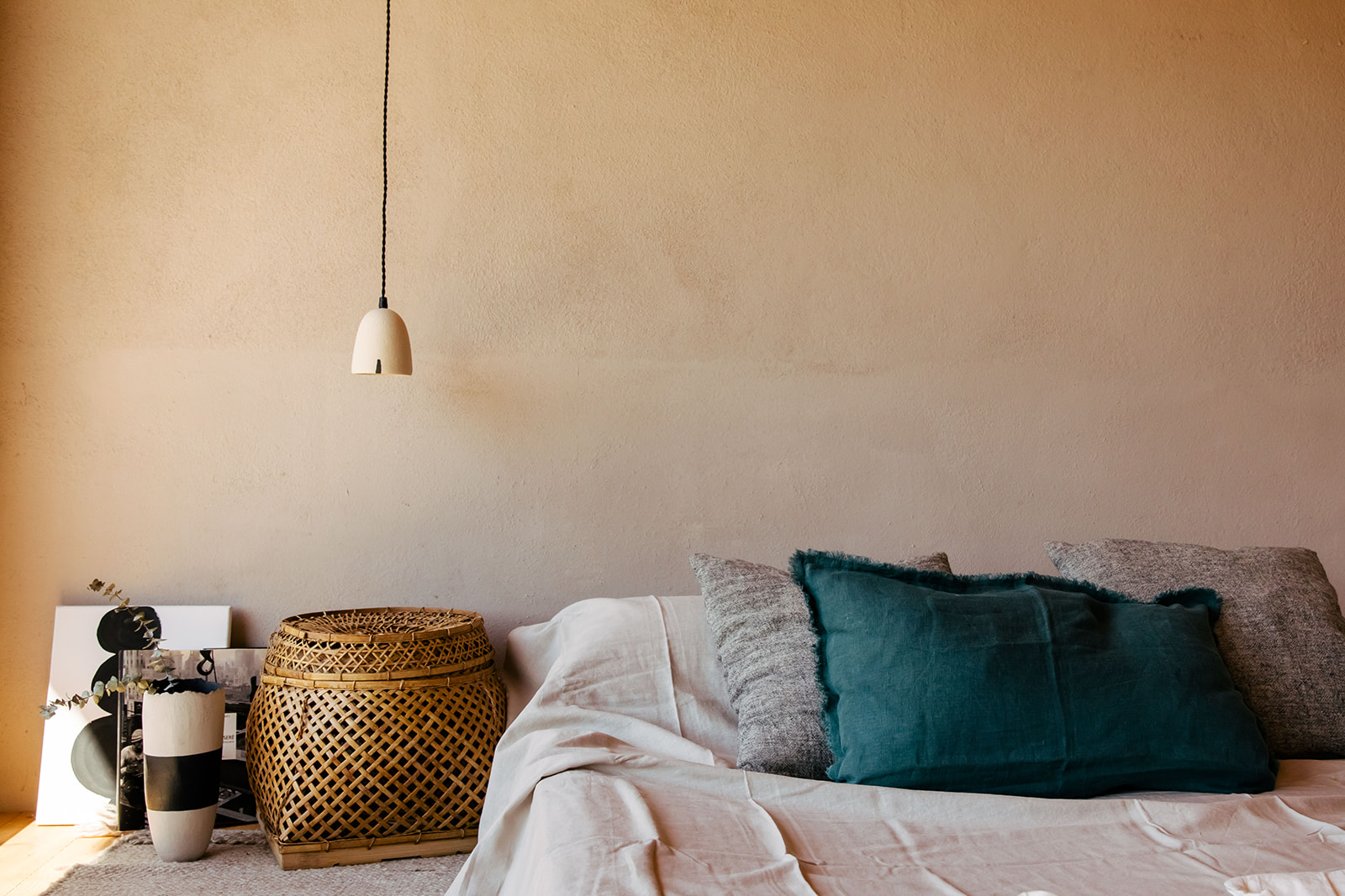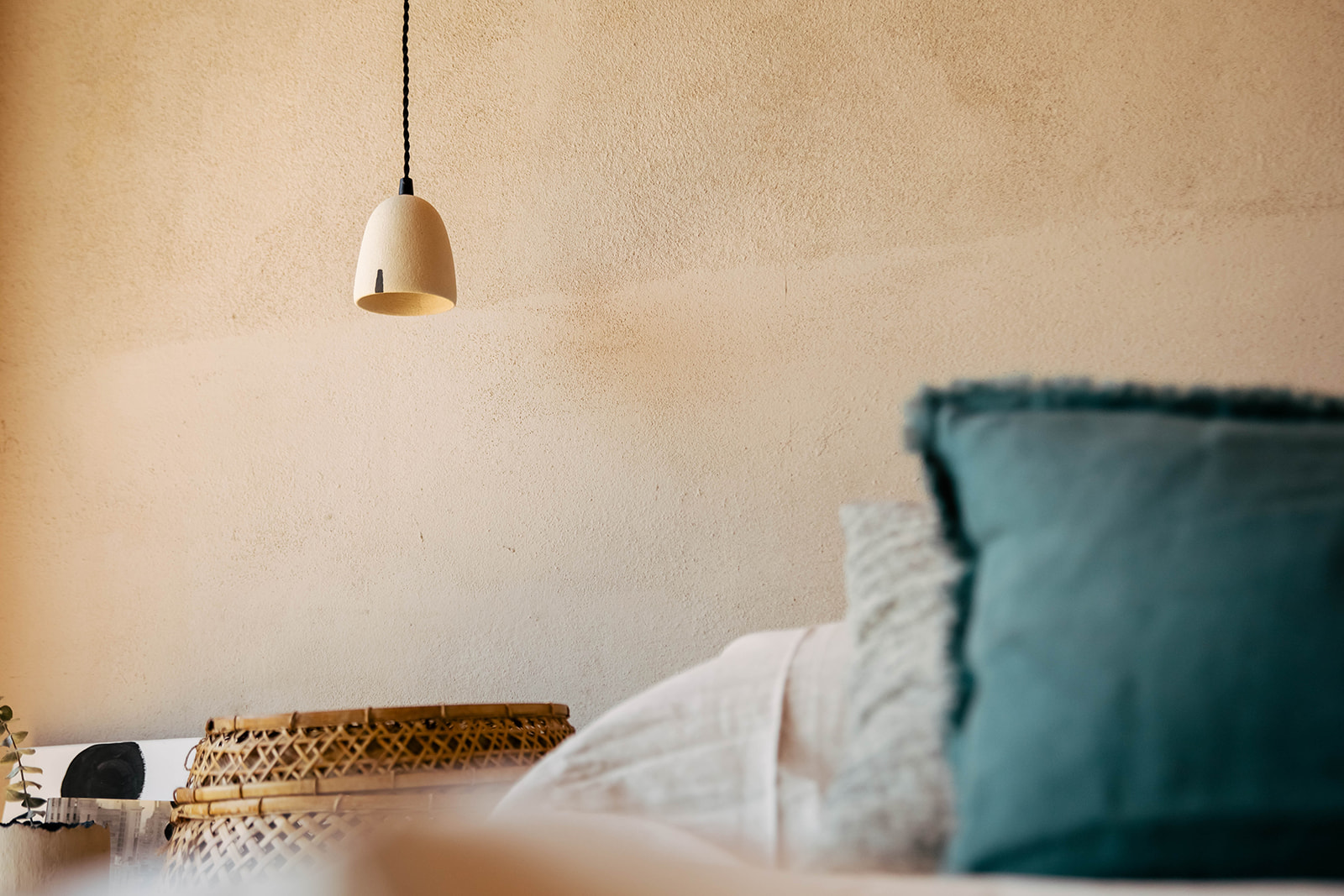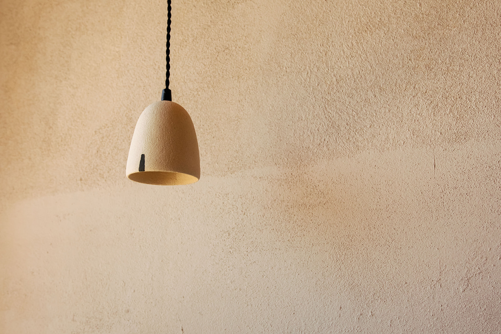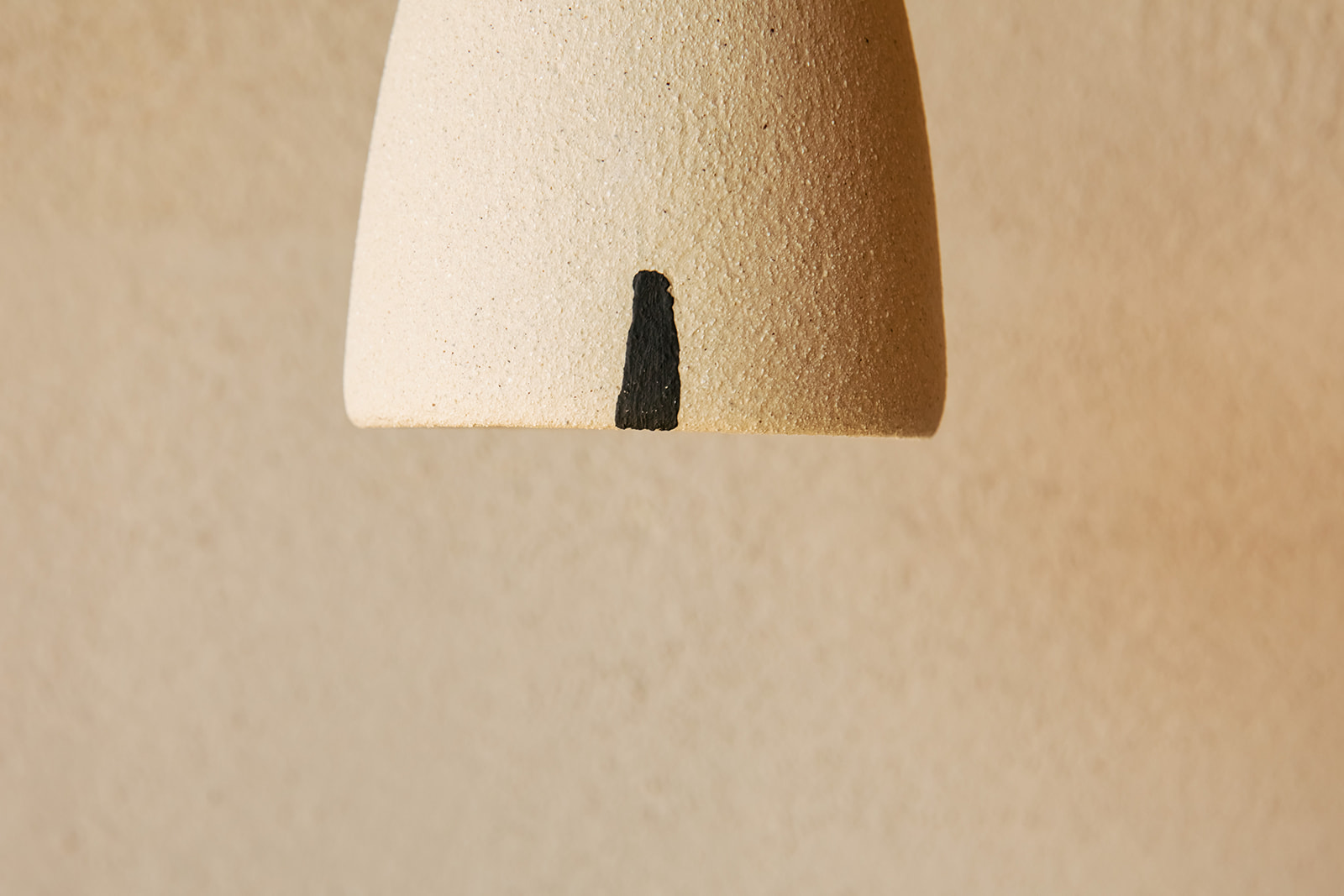 Ceramic pendant light made of a creamy stoneware clay and a little detail in black in a contemporary minimalist design.