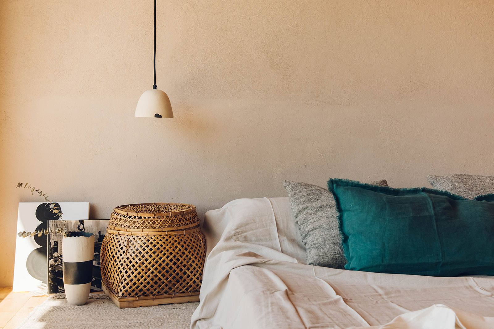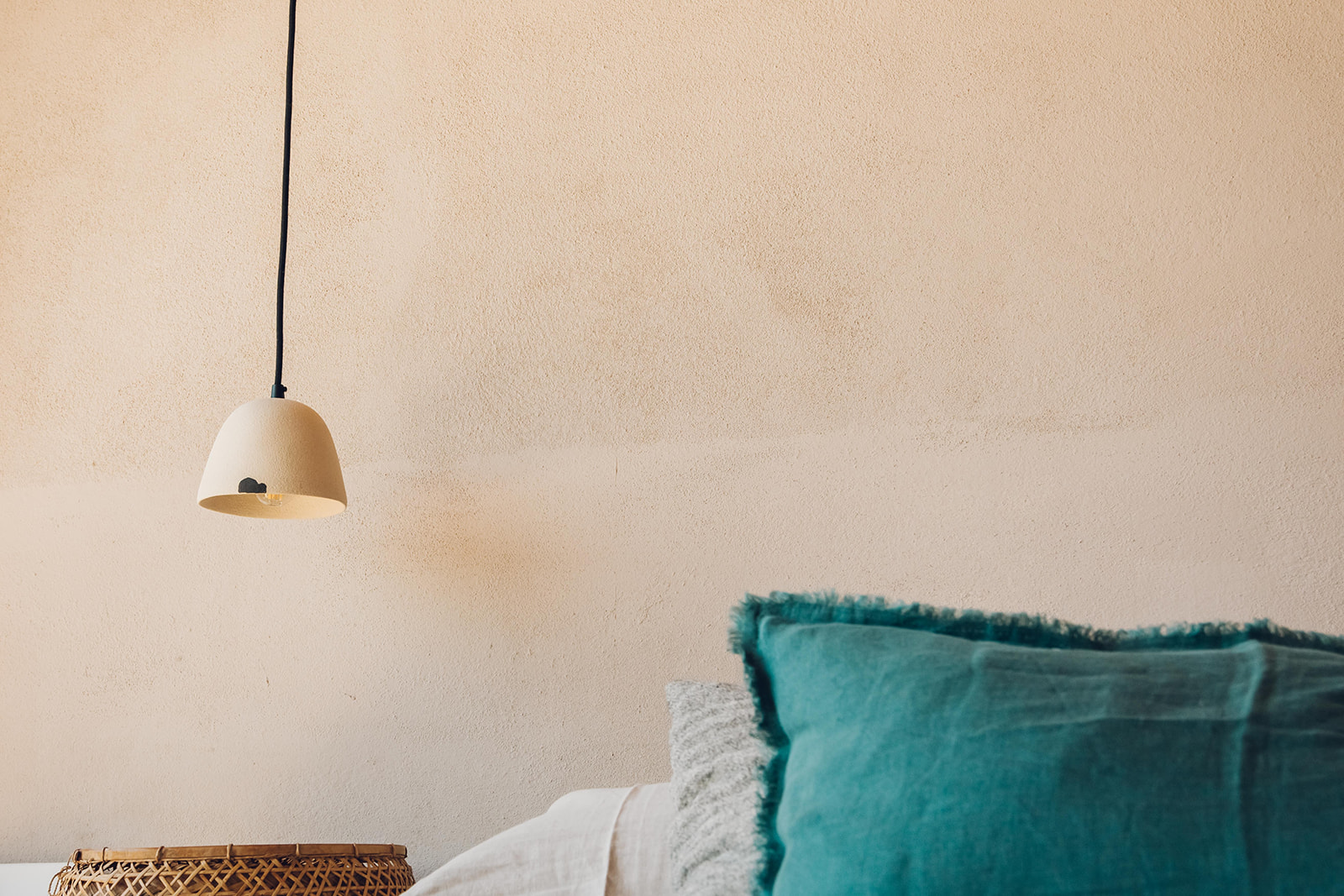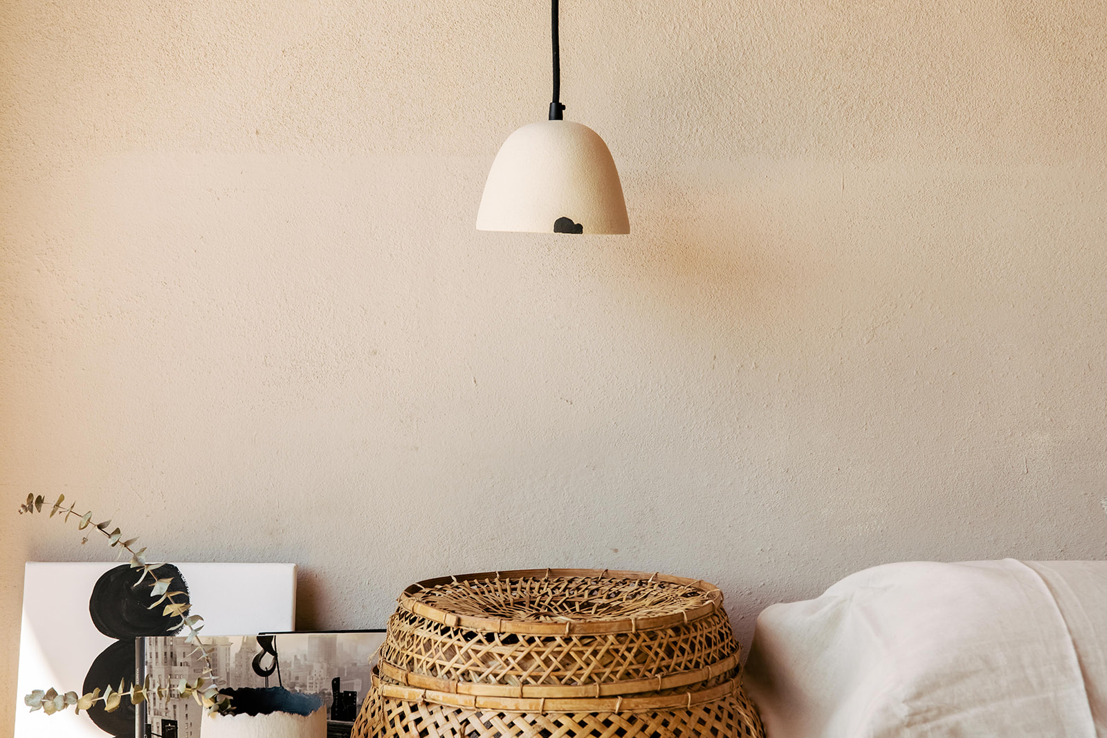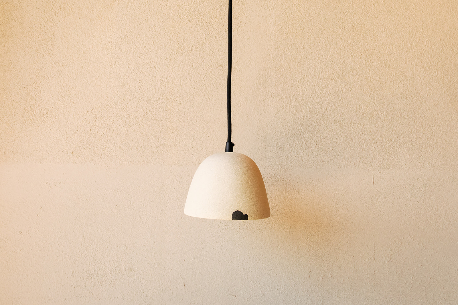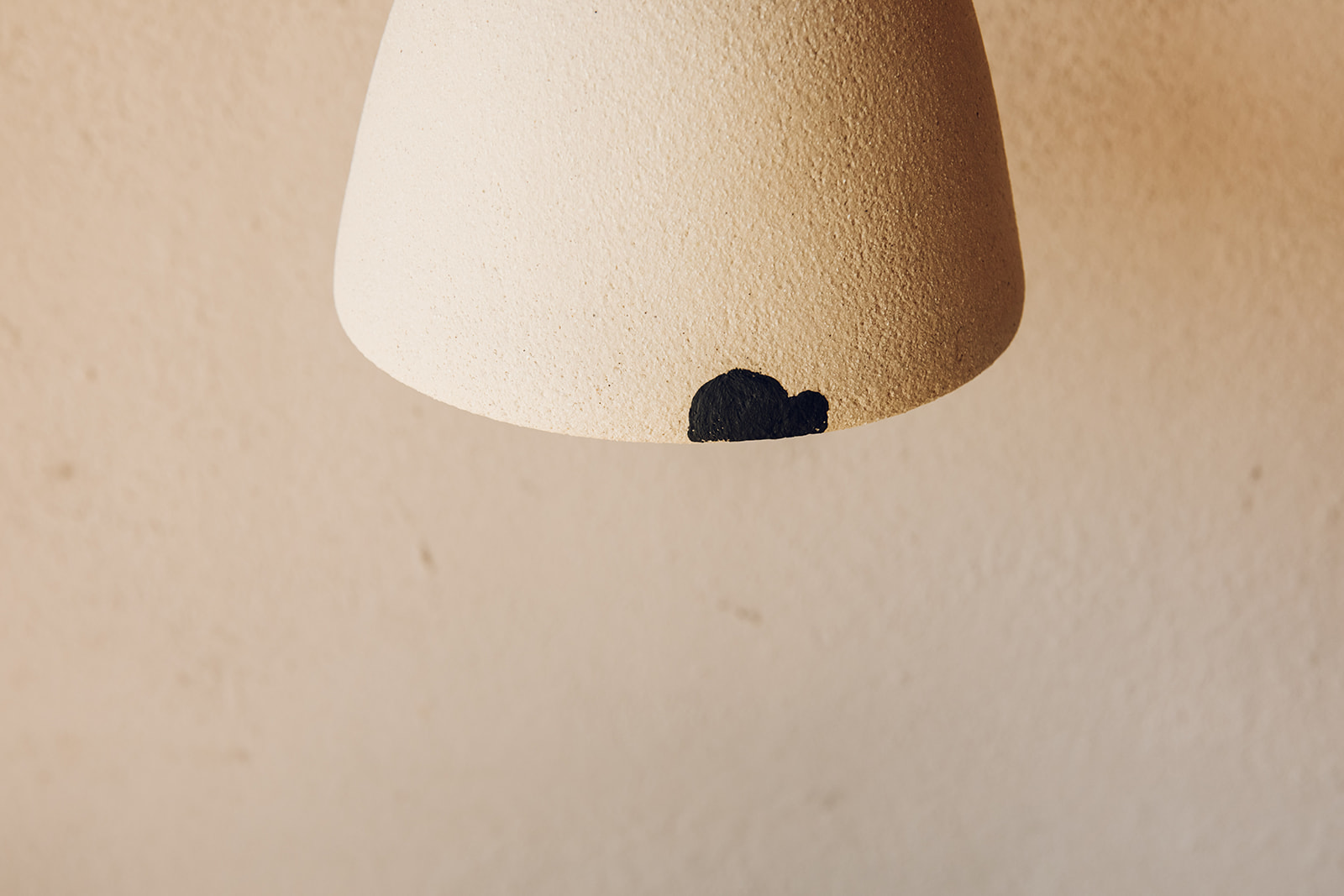 Ceramic pendant light made of a creamy stoneware clay and a little detail in black in a contemporary minimalist design.